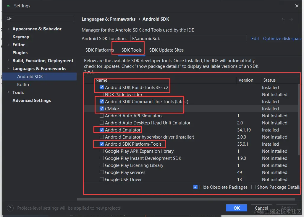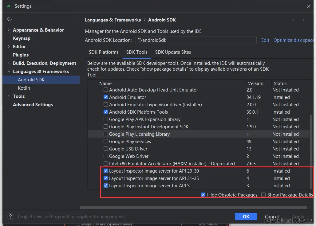 在 SDK Manager 中选择"SDK Platforms"选项卡,然后在右下角勾选"Show Package Details"。展开Android 13 (Tiramisu)选项,确保勾选了下面这些组件(如果你看不到这个界面,则需要使用稳定的代理软件):