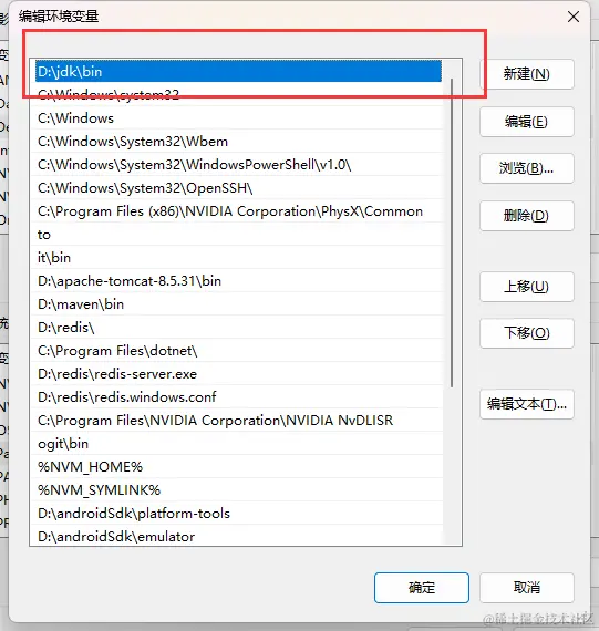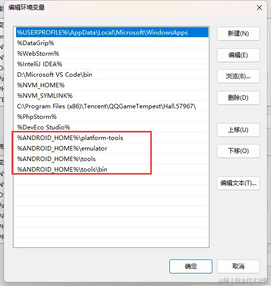 打开控制面板 -> 系统和安全 -> 系统 -> 高级系统设置 -> 高级 -> 环境变量,选中Path变量,然后点击编辑。点击新建然后把这些工具目录路径添加进去:platform-tools、emulator、tools、tools/bin
