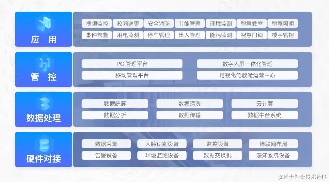 硬件方面,经过物联网布局,对校园内的监控设备、智能门锁、动力用电、安全环境等完结一致对接和数据源监测。软件层面,与校园原有体系树立数据交流接口规范,完结各事务体系间的互联互通,数据同享。