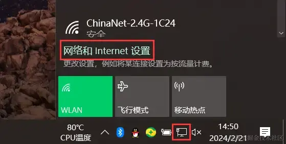 电脑ip地址怎么修改?在右下角系统托盘中找到网络连接图标,双击打开网络窗口,点击并选择**【网络和Internet设置】**。