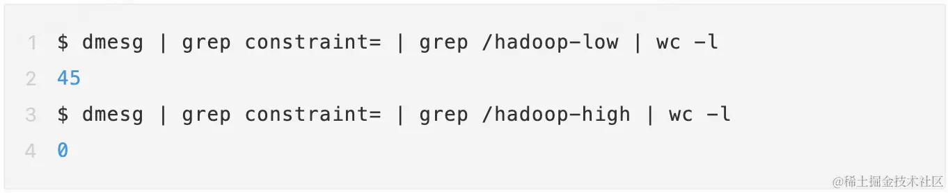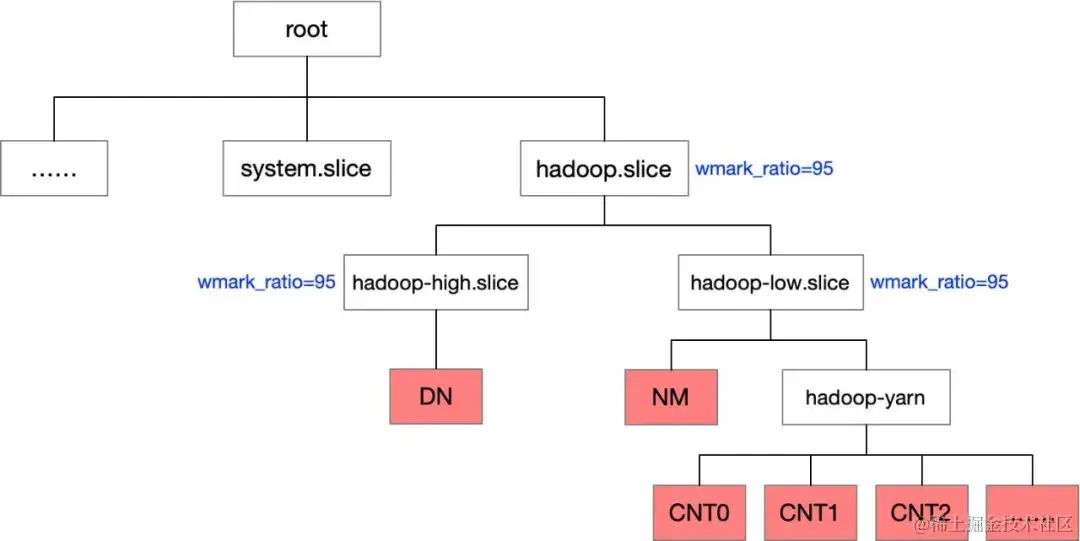 其次,对各个层级配置如下图所示。配置完成后,优先级分为前文所述三层,DN优先级最高,NM优先级次之,任务容器(CNTx)优先级最低。当hadoop.slice层级触发memcgroup OOM时按优先级从低到高选择任务杀掉;当hadoop-low以及hadoop-yarn层级触发了memcgroup oom也只会杀NM或任务容器,保障了DN受影响程度最低。