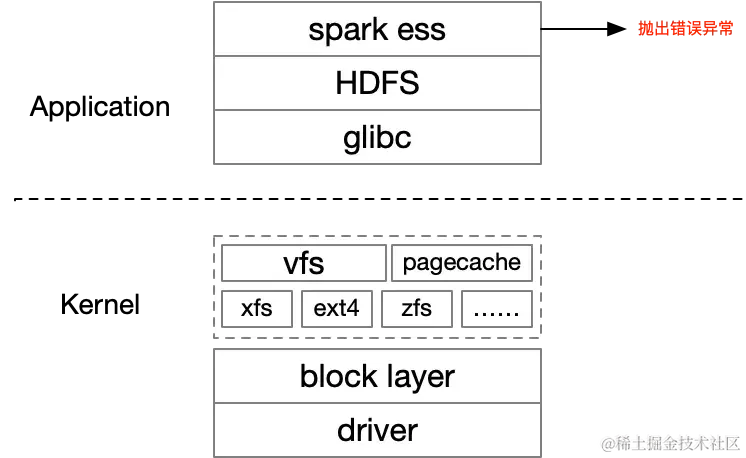 由于IO链路较长如下图,首先在大数据团队协助下,完成了应用层排查,但并未发现可疑点。开始排查内核IO栈。