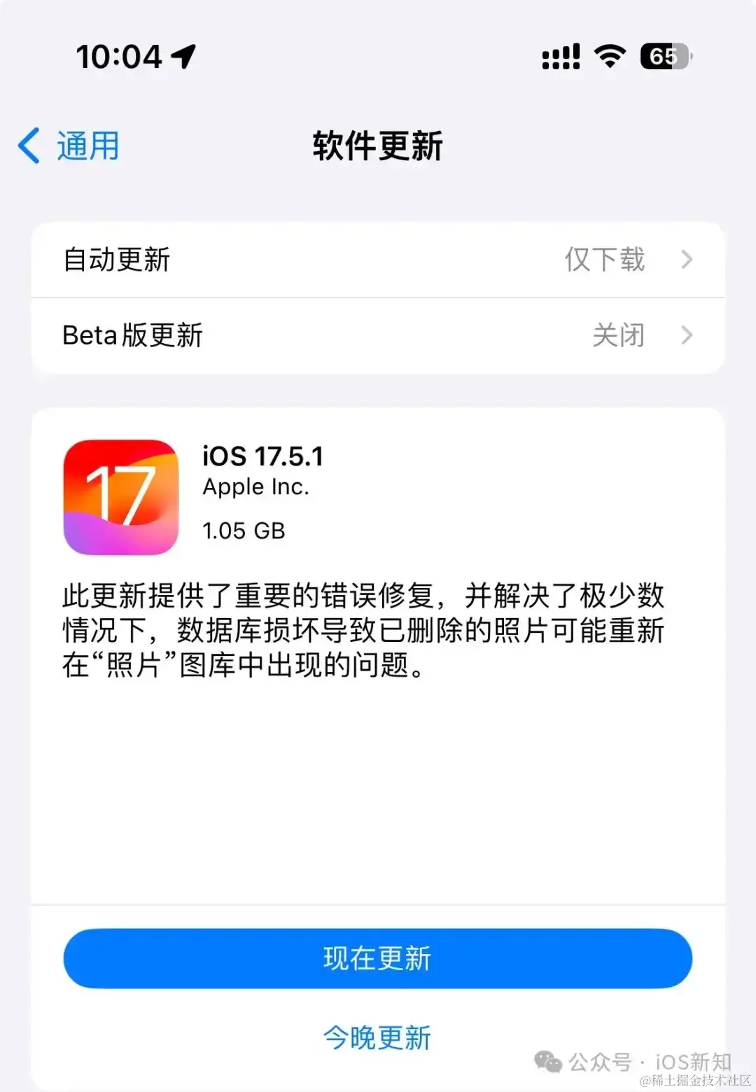 昨天文章中已经说了,如果苹果意识到这个问题,会很快发布更新来修复,这不,今天的修复版本 iOS 17.5.1 就紧急发布了。而这个版本主要功能就是修复这个漏洞的,因此建议大家及时更新。