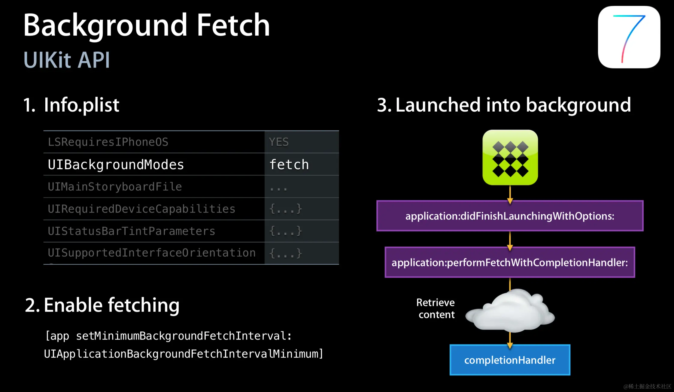 实现代理方法 application:performFetchWithCompletionHandler:在该代理方法中请求相关数据。
