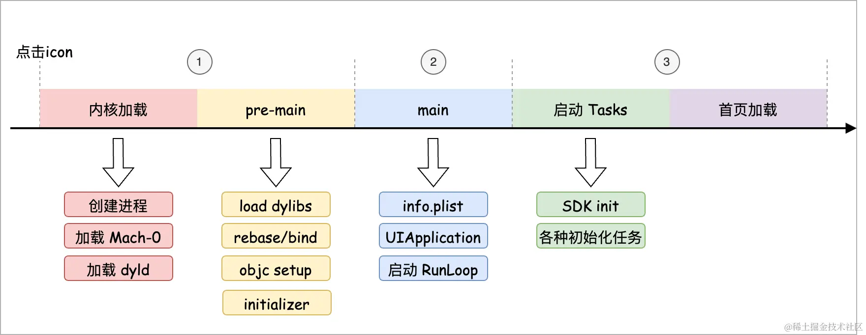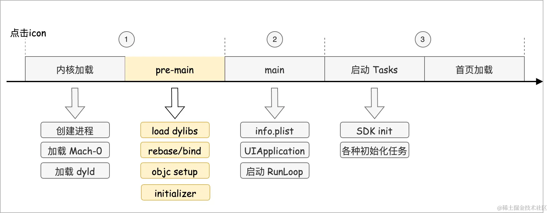 1.pre-main 阶段,即从点击App 的icon 开始,到 main 函数执行前;
