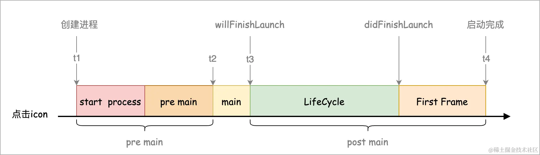 如下图所示,将启动过程划分了四个时间节点 t1~t4,可根据不同埋点需求来计算不同时段的耗时。