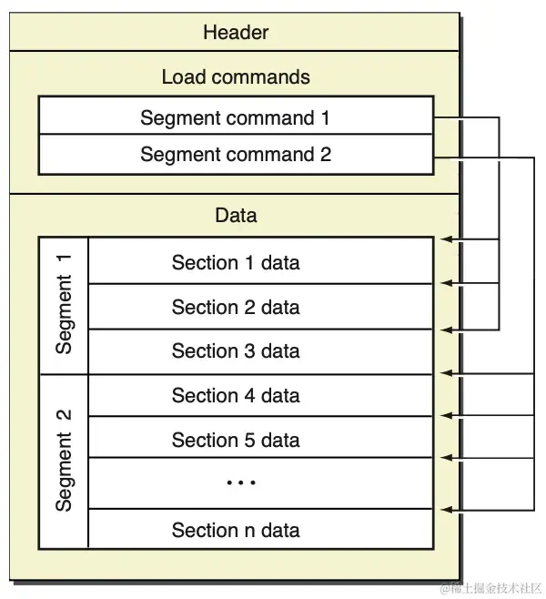 加载命令,包含文件的组织架构和在虚拟内存中布局的方式,比如 Segment command 和 Data 中的 Segment/Section 是一一对应的。 -
