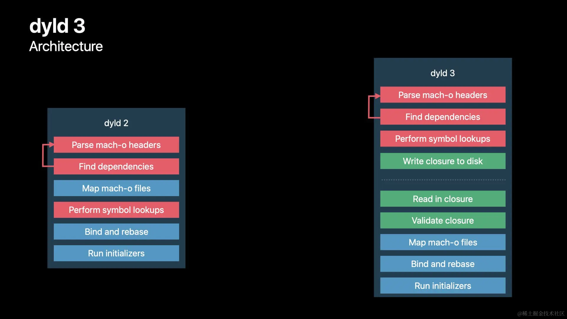 dyld3 是部分 in-process,部分out-of-process,上图虚线以上部分是 out-of-process 的,只有当 App 下载或版本更新的时候会执行,主要做: