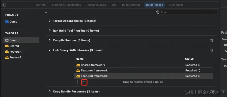 2.添加待合并的动态库到工程中,并添加到 “Build Phases” -> “Link Binary With Libraries”中
