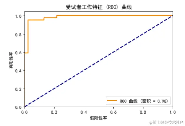 曲线越接近左上角,模型的性能越好。在这次运行中,曲线下的面积(AUC)为 0.98,表示模型在区分正负类样本时具有很高的性能。很强大