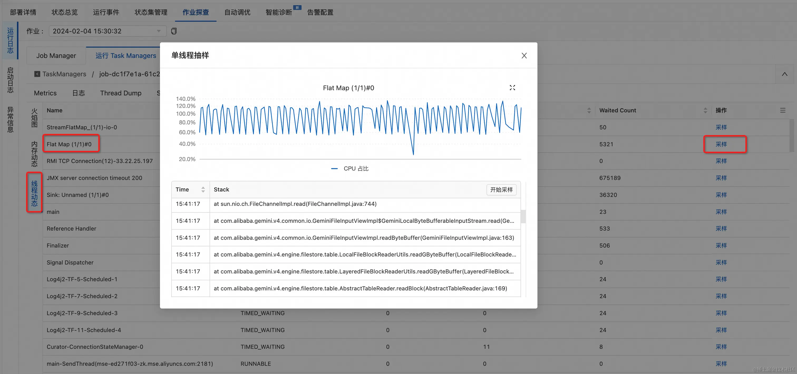 (2)进入线程动态页面并按 1 中的瓶颈算子名搜索其线程栈并采样一段时间,观察其线程栈,如下即可观察到 Gemini State 访问的线程栈