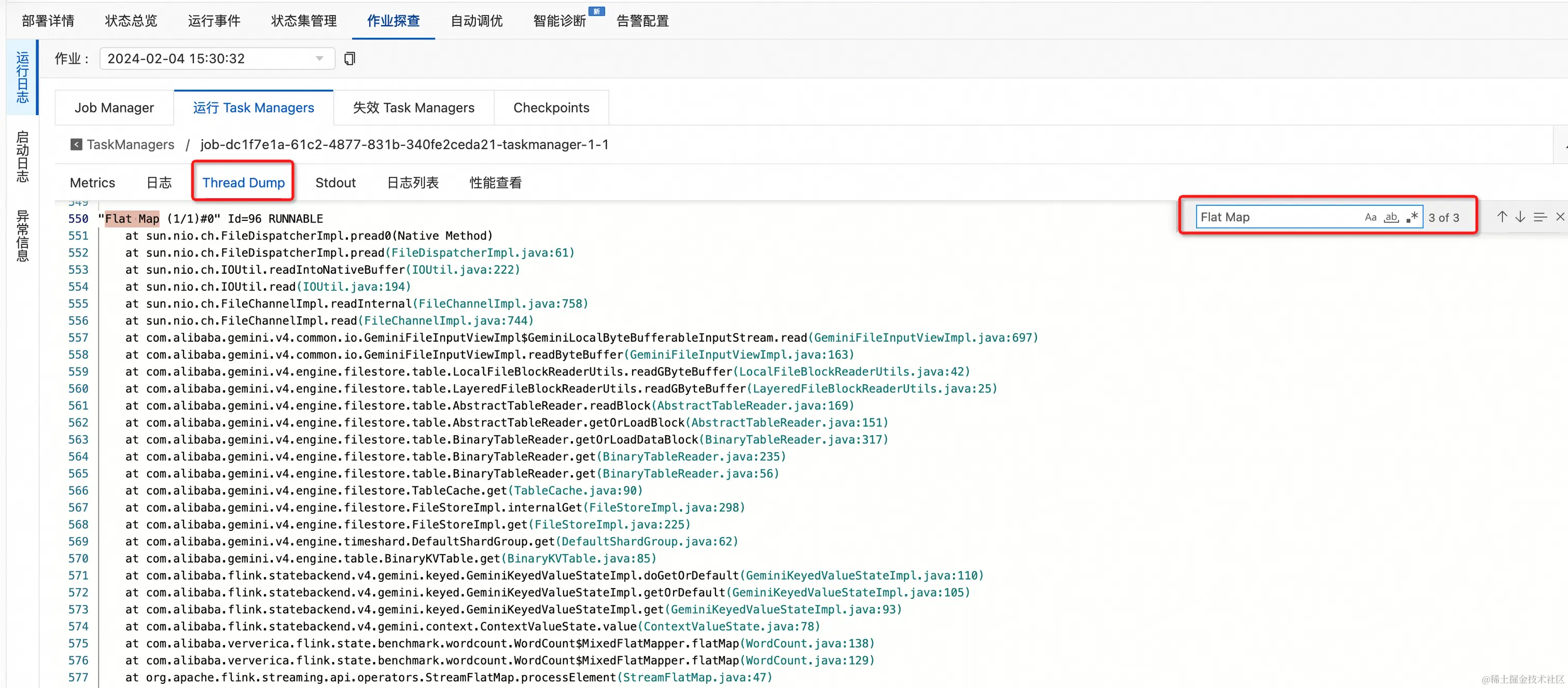 (2)进入 Thread Dump 页面 并按 1 中的瓶颈算子名搜索其线程栈,如下即是 Gemini State 访问的线程栈