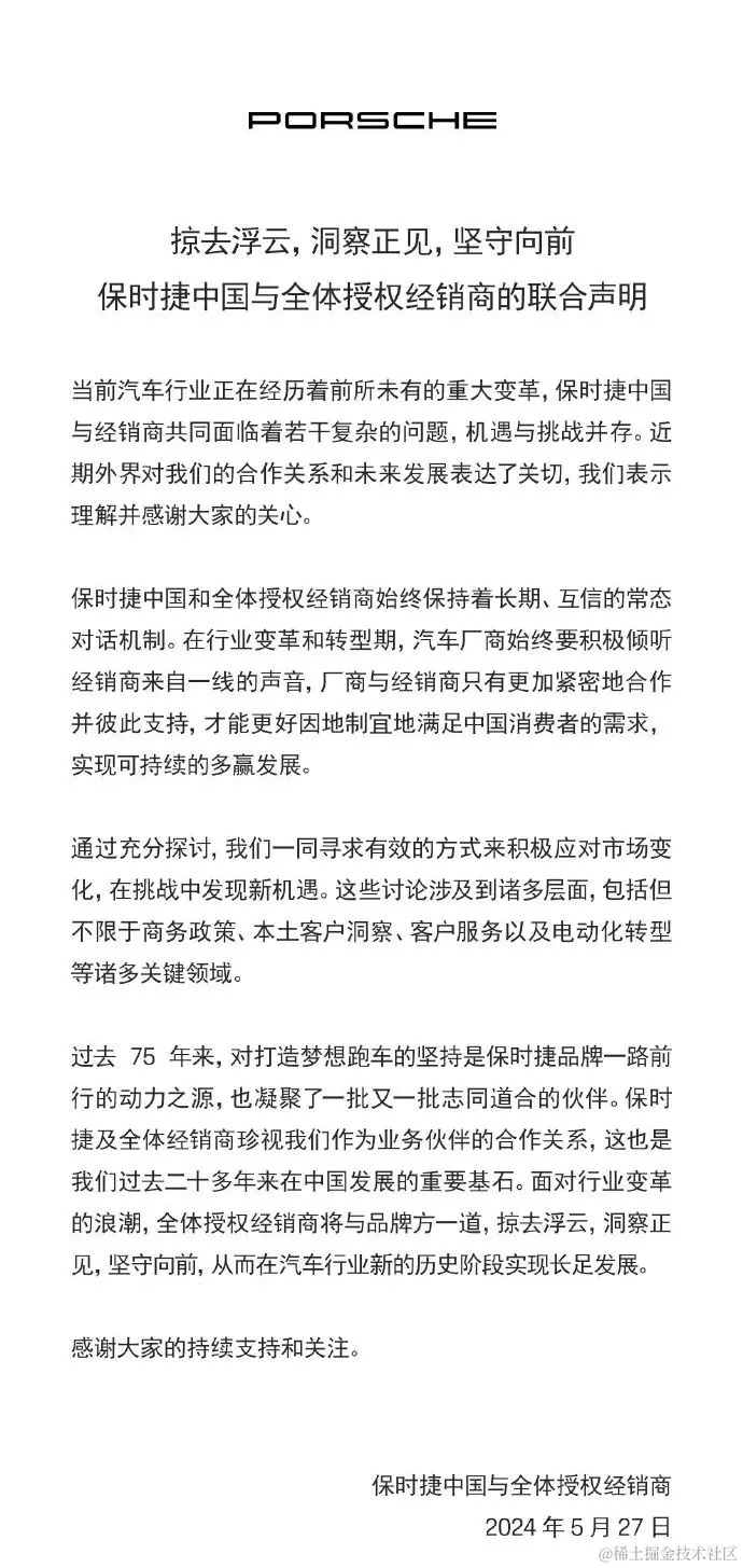 到这里为止,此事看似圆满解决了。但不知道保时捷的经销商是如何看待这份联合声明的,毕竟除了场面话之外,既没有提出解决方案,也没有应对市场的措施。在握手言欢的表象之下,“保时捷在中国卖不动”这一本质问题,其实还没有得到解决。