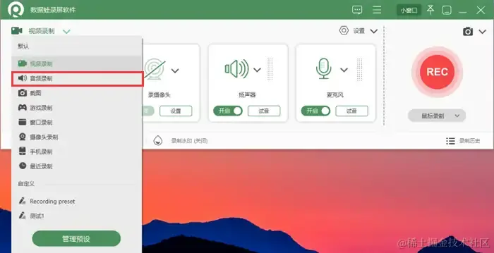 第1步:从官方网站下载并安装数据蛙录屏软件,打开软件默认进入到视频录制页面,点击左上角的倒三角图标,选择 “音频录制” 。