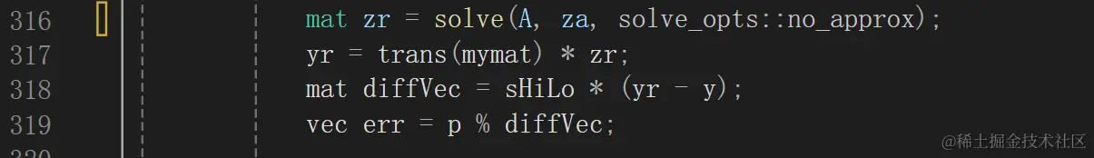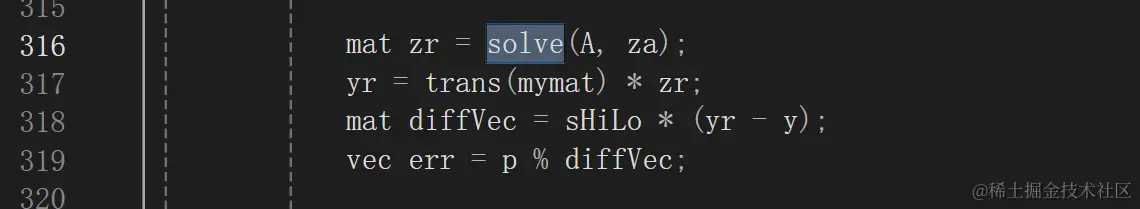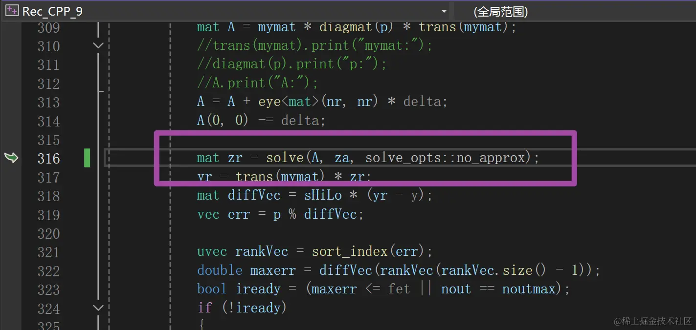 在本文的代码中,是在调用Armadillo模块的solve()函数时出现这个错误的;如下图所示。