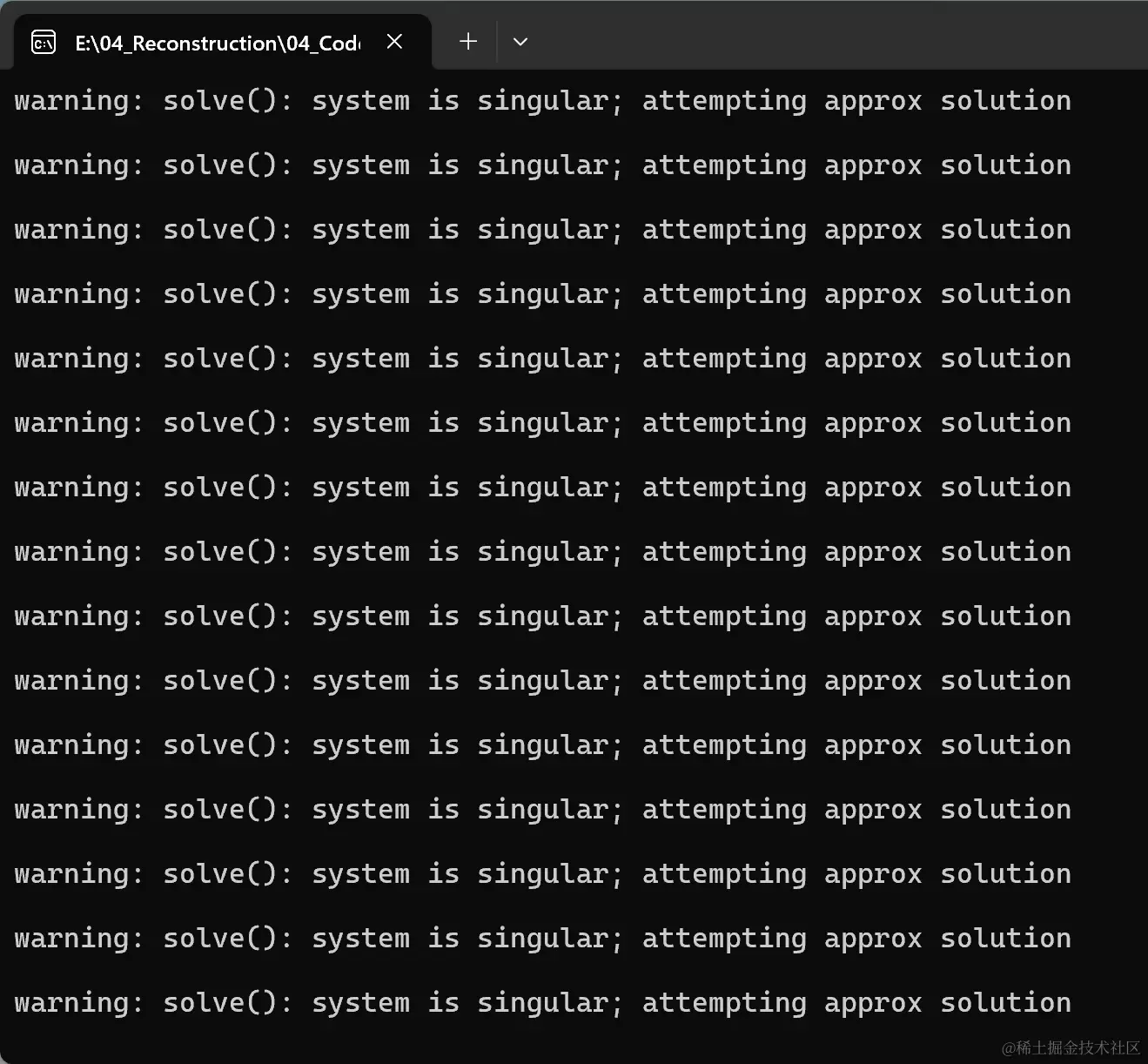 在之前的文章中,我们介绍过# Visual Studio安装C++矩阵库Armadillo,并且也介绍过# 转换Armadillo库与OpenCV库的矩阵格式:mat、vec与Mat。而在使用Armadillo模块加以矩阵计算时,出现了1个问题——我这里会经常出现warning: solve(): system is singular; attempting approx solution字样的报错。而且因为我代码中调用Armadillo模块加以矩阵计算的次数非常多,导致这个报错会出现非常多次,如下图所示。