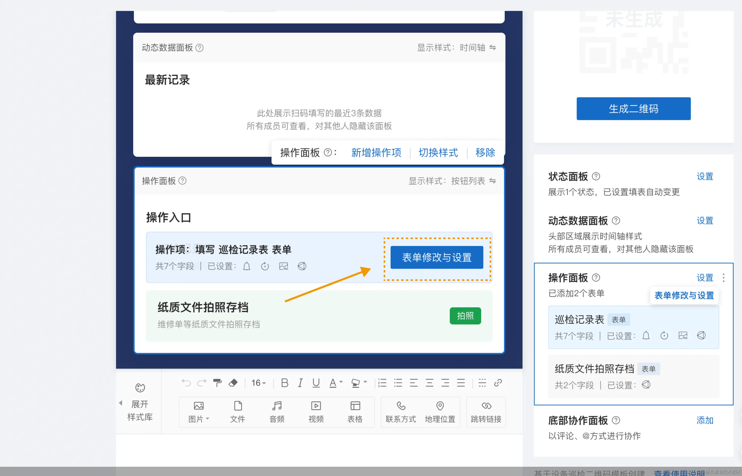 编辑二维码,将鼠标移动至【操作面板】上方,点击【表单修改与设置】。