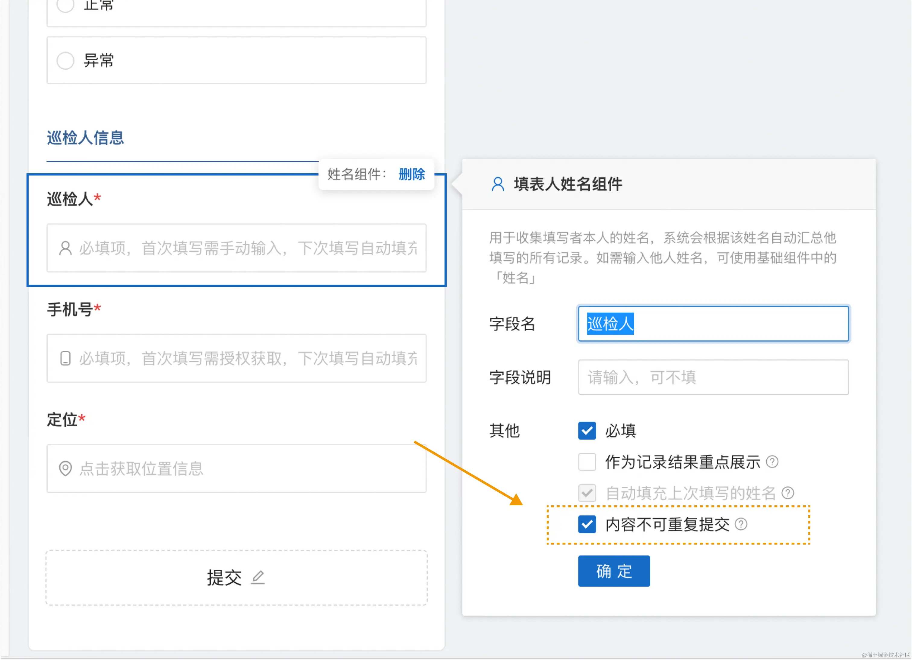 点击需要设置的组件,在右侧区域勾选【内容不可重复提交】。
