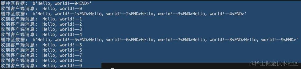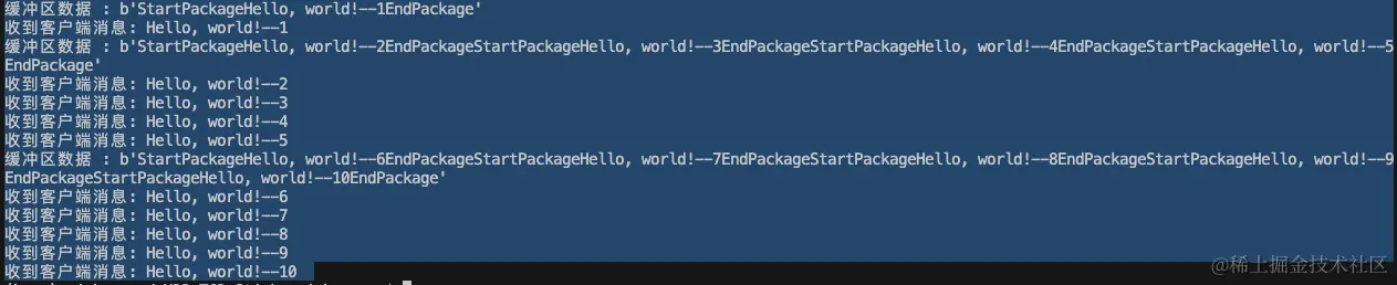 可以看到也是出现了数据堆积,粘包,但是最后打印的结果是正确的。通过使用数据包分隔符,保证数据的完整性。