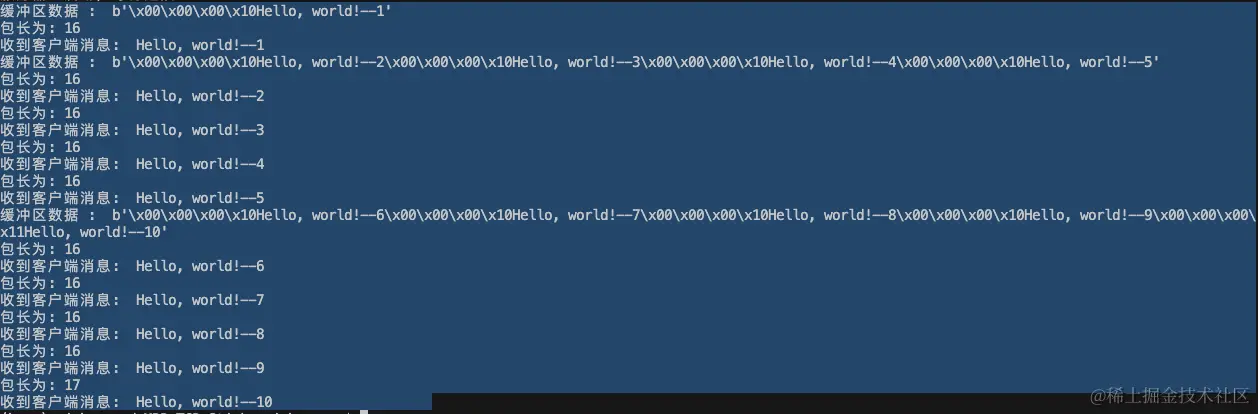 可以看到由于处理的时间过长,导致数据堆积在缓冲区形成粘包。通过在消息头部设置包长,确定数据包的完整性。通过包长将粘包进行拆包。