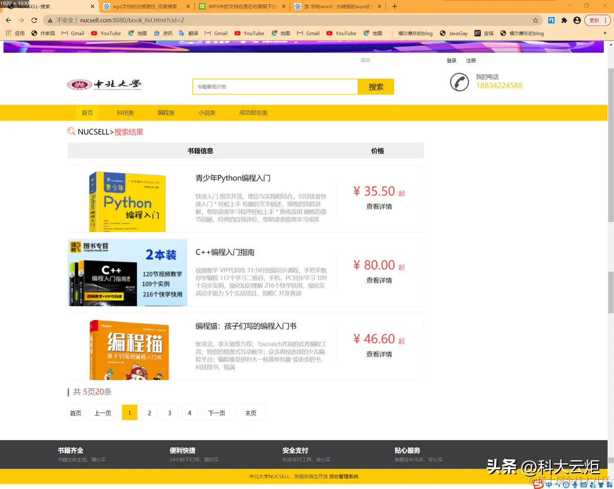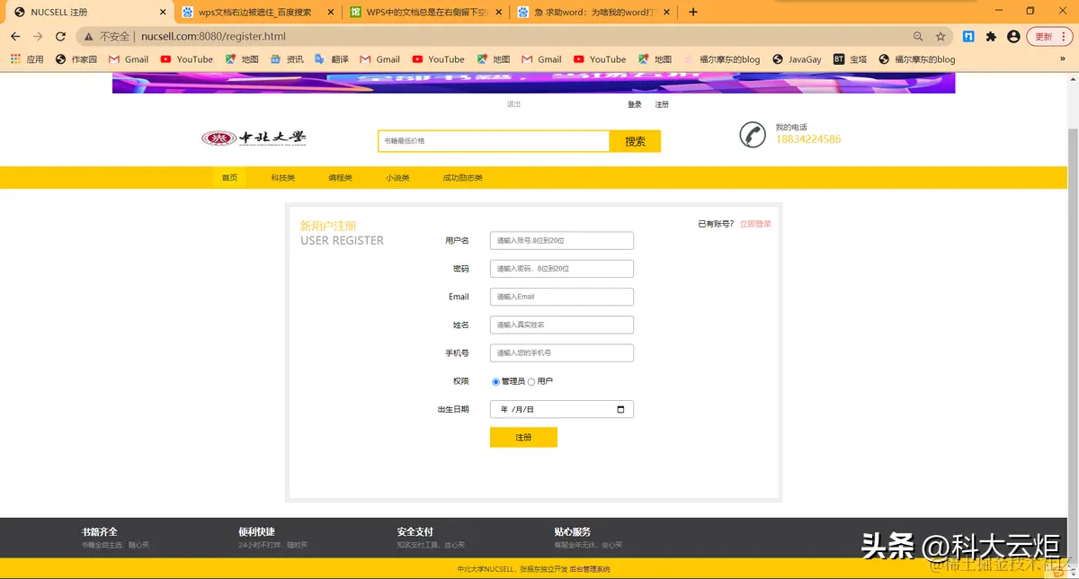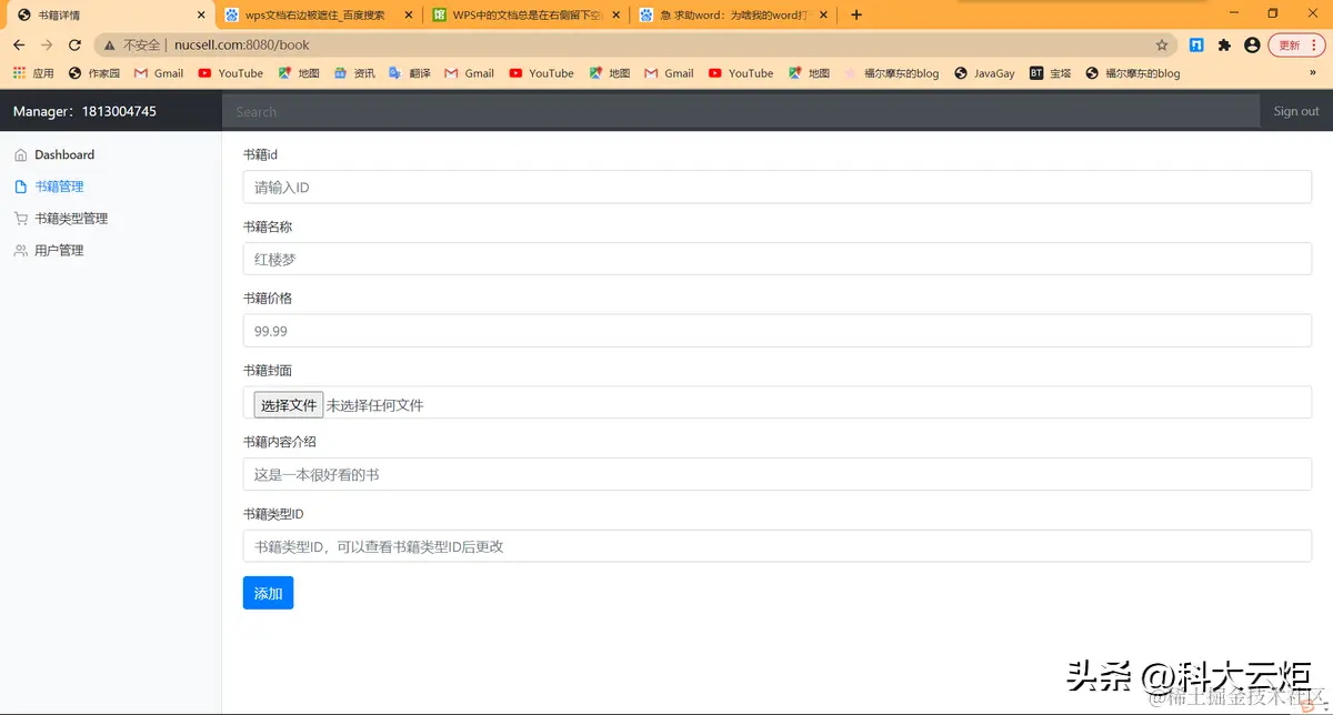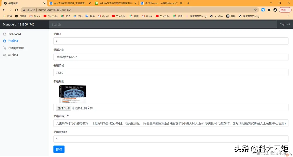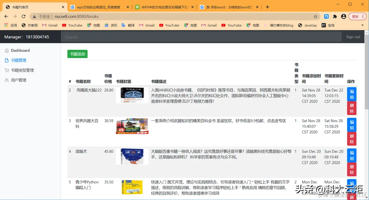 | 3.实验内容1.NUCSELL是一个图书网站2.用户可以登录,注册,查看分类书籍并查询3.管理员登录后可以在后台对图书进行增删改查4.管理员登录后可以在后台对图书类型进行增删改查5.管理员登录后可以在后台对用户进行增删改查6. 希望可以对此项目进行更多的优化和扩展本项目由18130Y03张振东独立开发,本项目基于IDEA进行开发,使用到了Swagger接口文档进行开发,使用Github进行协同开发,使用SpringBoot+BootStrapUI进行开发,数据库使用云端数据库进行搭建并开发,使用nginx进行反向代理(本项目域名为www.nucsell.com:8080),本项目曾使用docker部署到阿里云服务器上,基本使用Restful风格的接口,符合阿里巴巴开发规范。系统架构解读:整个系统可以分为两部分:后台管理系统,前台展示系统。后台管理:①对图书的管理:包括图书封面,图书类型,图书价格等信息的管理②对图书类型的管理:对多种类型的图书分类进行管理③对用户的管理:包括用户的类型,用户的姓名,生日等进行管理。后台系统采用SpringBoot+BootStrap进行开发,后台页面使用thymeleaf进行展示。预览图: | |||