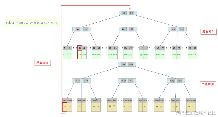 - 由于是根据name字段进行查询,所以先根据name='Arm'到name字段的二级索引中进行匹配查找。但是在二级索引中只能查找到 Arm 对应的主键值 10。