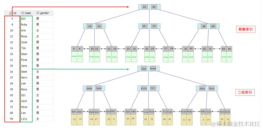 - 二级索引的叶子节点挂的是该字段值对应的主键值