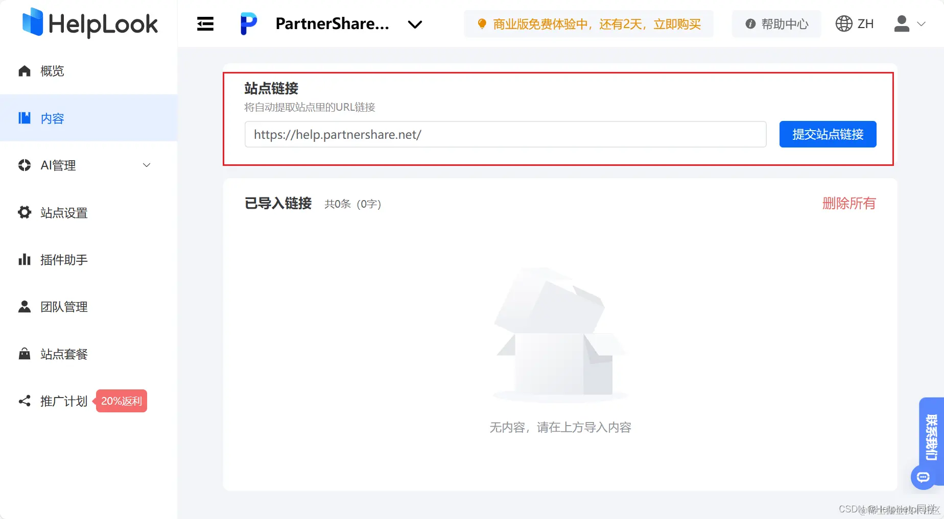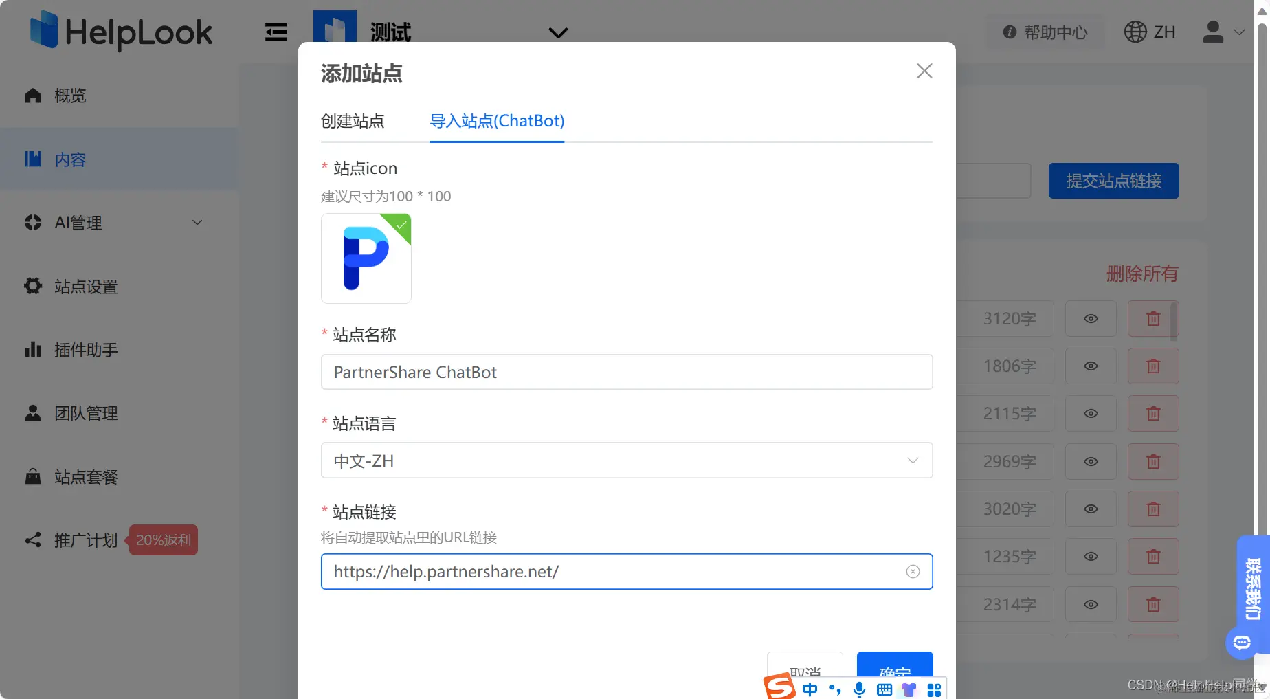 「创建站点」-> 导入站点(ChatBot),在此之前,需要注册HelpLookAI知识库账号。注册成功并创建站点后,选择导入站点,输入你需要关联的站点的信息和链接,如图