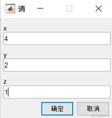 yy=inputdlg({'x','y','z'},'请输入',[1 30;1 30;1 30;],{'6','0','0'})