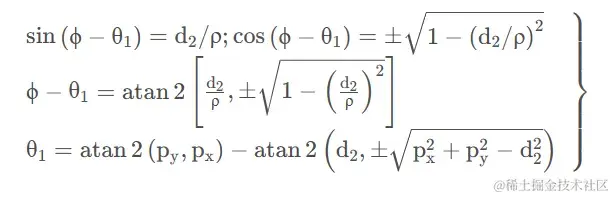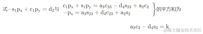 方程a3c3−d4s3=k中已经消去θ2,且方程a3c3−d4s3=k与−s1px+c1py=d2具有相同形式,因而可由三角代换求解得到θ3