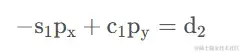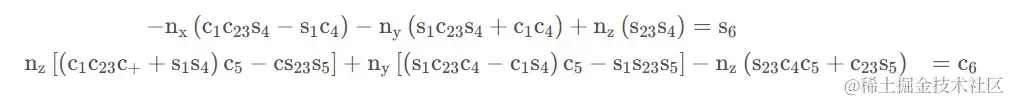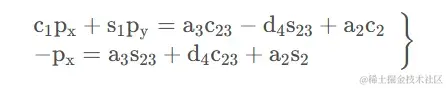 在选定θ1 的一个解之后,再令矩阵方程1T6 两端的元素的 ( 1 , 4 ) (1,4)(1,4) 和 ( 3 , 4 ) (3,4)(3,4) 分别对应相等,即得两方程