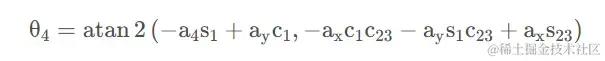 上式方程式的右边 4T6(θ5,θ6)=4T5(θ5)5T6(θ6),由正解得到的4T6给出。据矩阵两边元素 ( 1 , 3 ) (1,3)(1,3) 和 ( 3 , 3 ) (3,3)(3,3) 分别对应相等,可得
