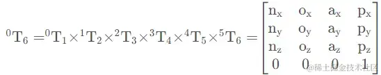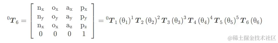 对该六个齐次变换矩阵按顺序相乘后得到六自由度机器人的总变换: