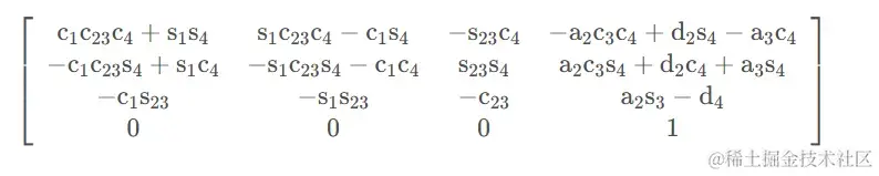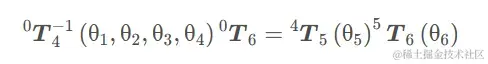 因下面方程式的左边θ1,θ2,θ3 和 θ4 均已解出, 逆变换0T4−1(θ1,θ2,θ3,θ4) 为