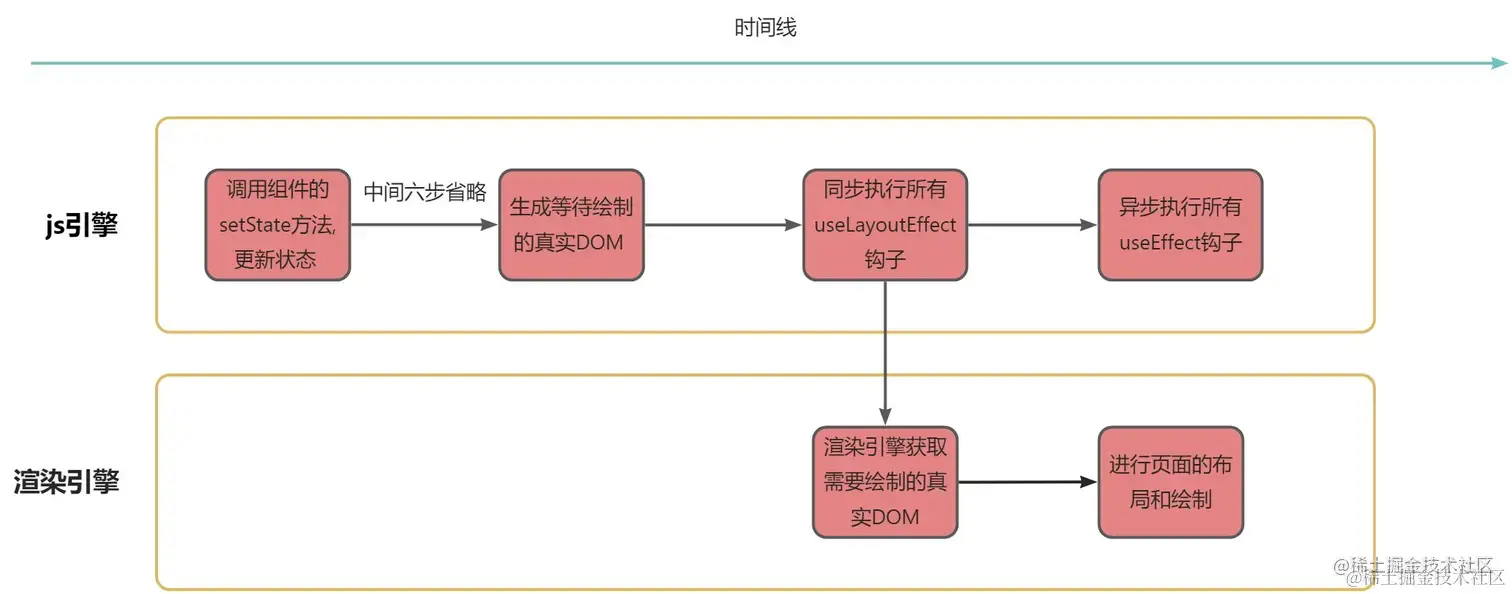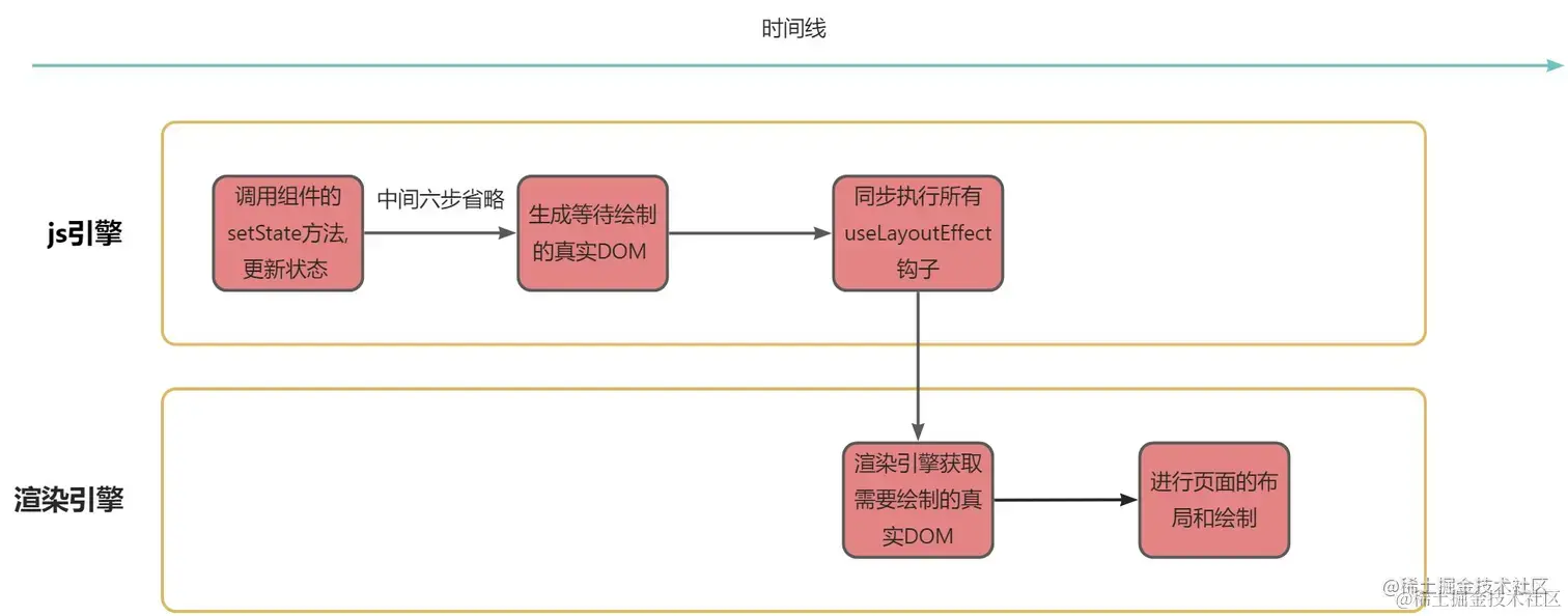 从上面图解我们可以看出,浏览器重新绘制之前应该是生成等待绘制的真实DOM的时间点,那就说明useLayoutEffect触发是在生成了真实并且等待绘制的真实dom之后触发的。官网上有说,我们需要注意的是useLayoutEffect是同步执行,会阻塞浏览器重新绘制,所以在生成真实dom之后,React会开始触发需要执行的useLayoutEffect钩子,等完全执行完所有useLayoutEffect之后才会把真实dom交给渲染引擎进行绘制。由于不管是useLayoutEffect还是useEffect钩子,都是js代码,所以都将在js引擎中执行,我们之前也解释了同步执行的逻辑,因此总结:useLayoutEffect会在生成真实dom之后,根据声明顺序同步执行,图解表示如下: