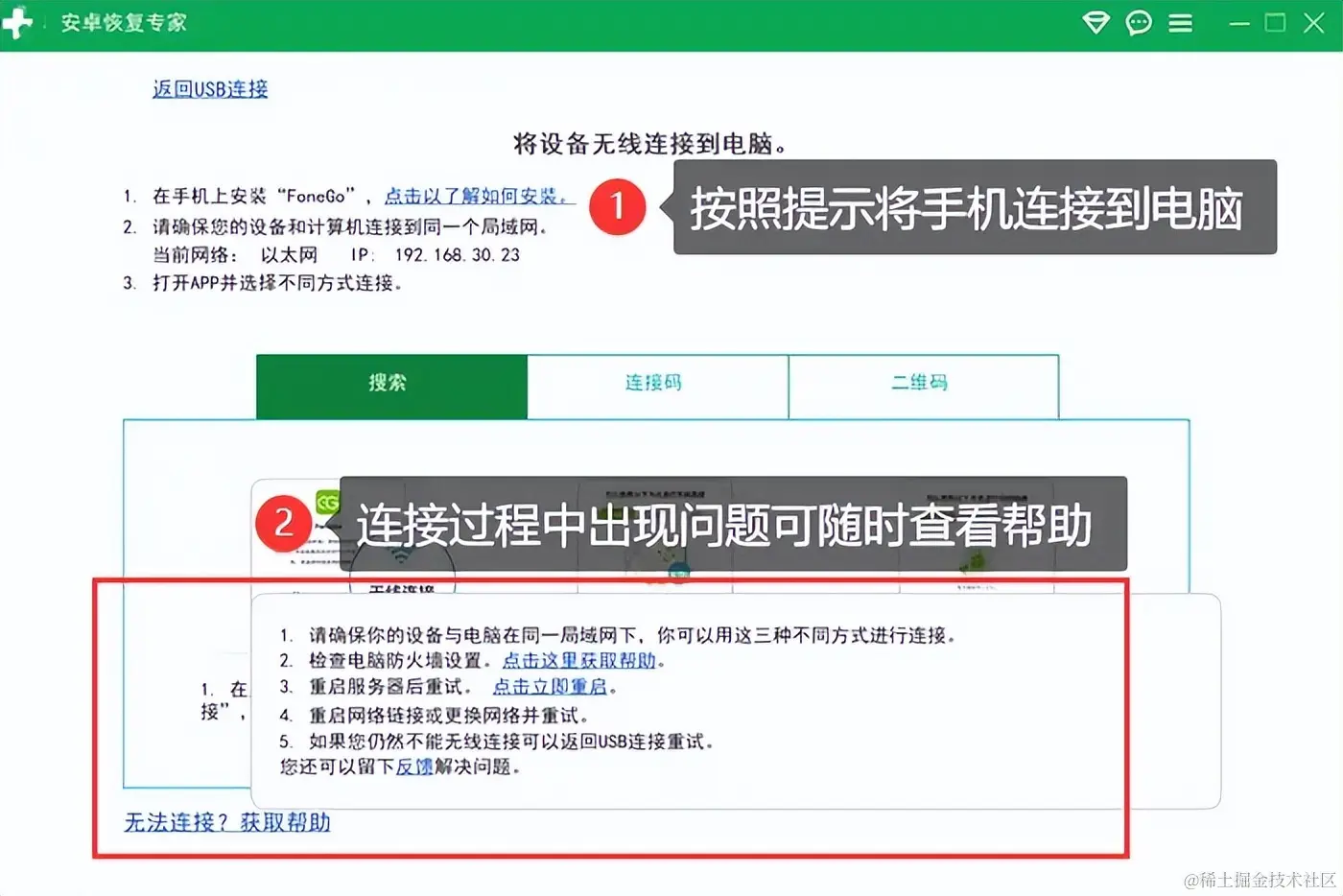 第一步:下载并安装该程序,确保手机开启了USB调试模式或与电脑连接同一网络,这样方便我们使用任意方式将手机连接到电脑。