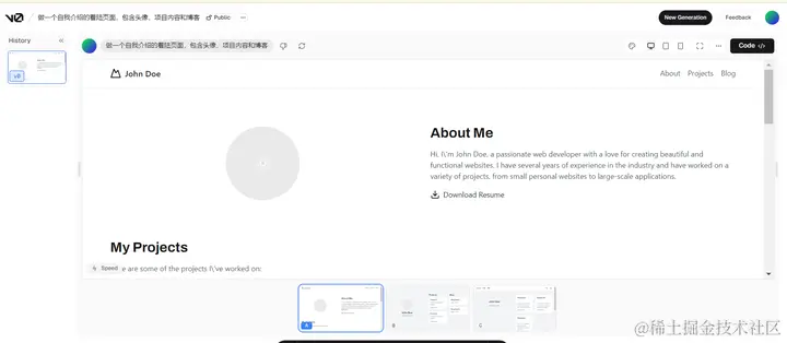 3、构建雏形产品,如果你想把友商的几个好的地方融合起来,可以向chatgpt描述,描述要包括:网站用什么语言,分几个界面,有哪些功能。但是我后来发现,其实用v0.dev/更快。具体如下,比如我像v0描述,做一个自我介绍的着陆页,包含头像、项目内容和博客。最后v0的情况如下。代码可以粘贴,但需要根据你当前代码结构改。这个步骤可以用chatgpt帮你完成。