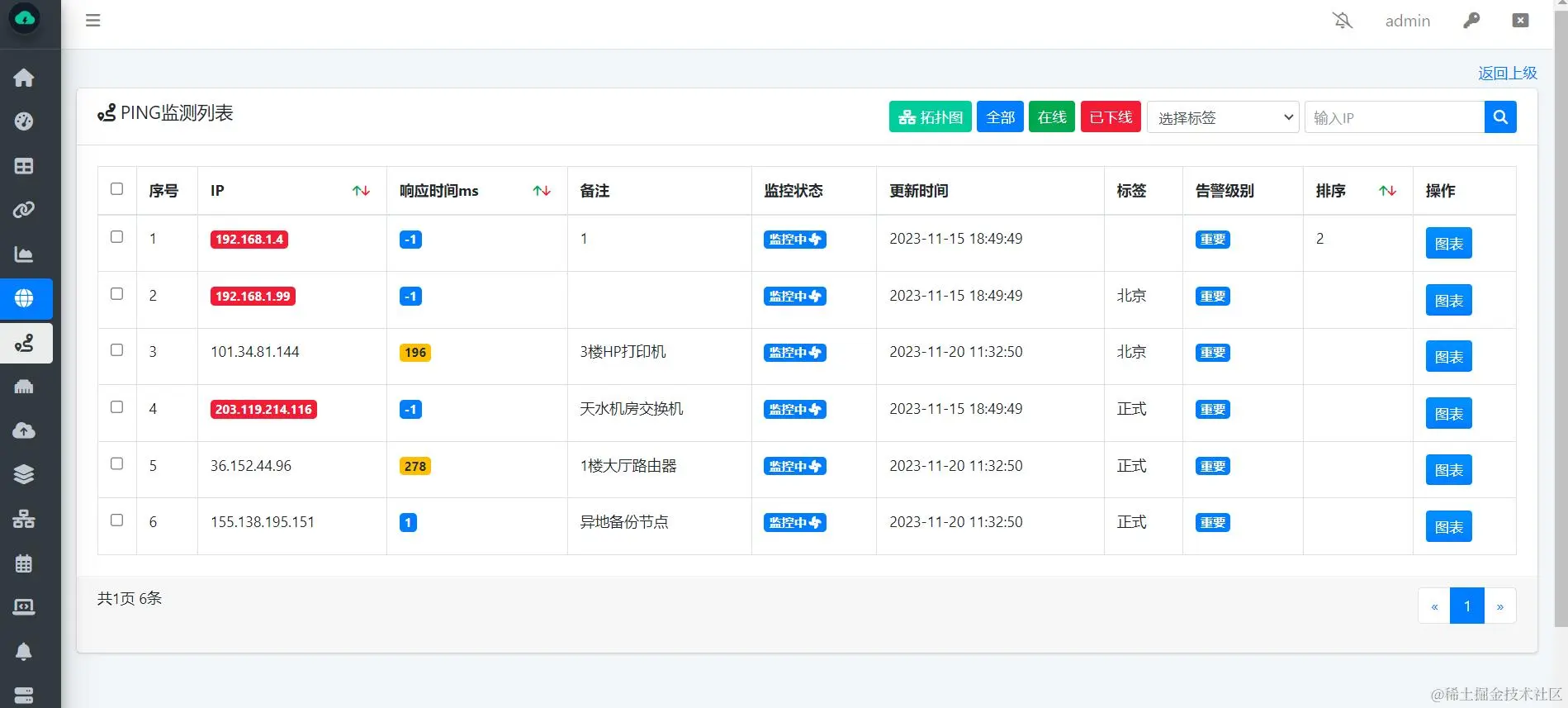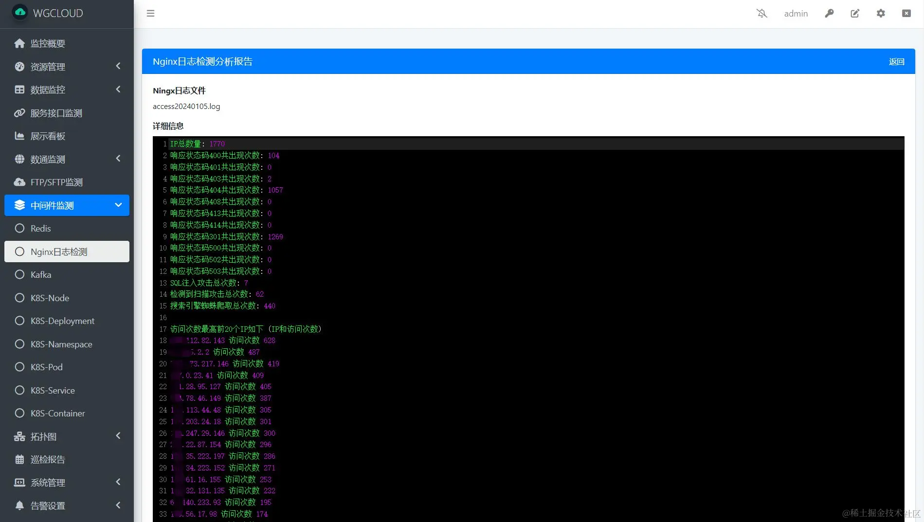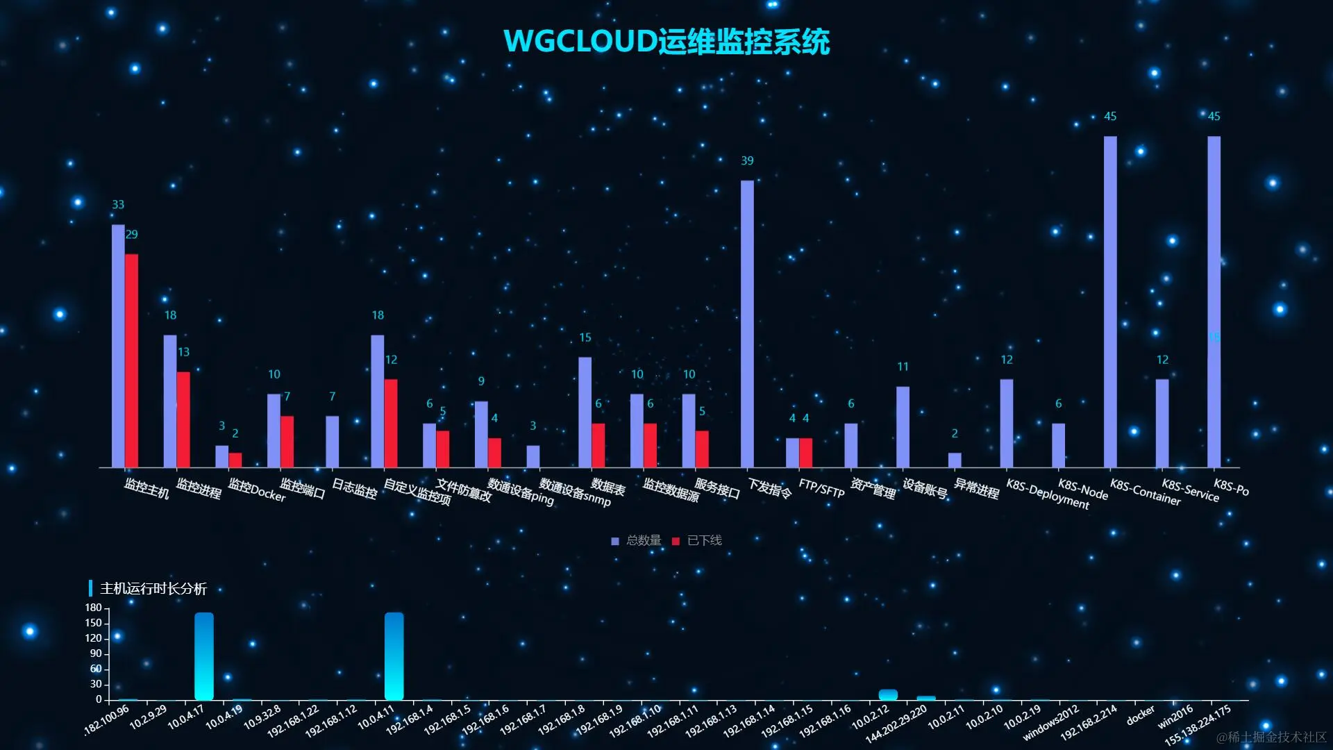WGCLOUD支持服务器或主机的各种指标监测(cpu使用率,cpu温度,内存使用率,磁盘容量空间,磁盘IO,硬盘SMART状态,系统负载,连接数量,网卡流量,硬件系统信息等)。支持监测服务器或主机上的进程应用、文件、端口、日志、DOCKER容器、数据库、数据表等资源。支持监测服务接口API、数通设备(如交换机、路由器、打印机)PING和SNMP监测、自定义监控指令等。自动生成网络拓扑图,大屏可视化,web SSH,统计分析报表,指令下发批量执行,FTP监测,K8S监测,Kafka监测,Redis监测,Nginx日志检测,资产管理,设备账号管理,故障告警信息推送(如邮件等)