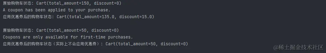 print("应用优惠券后的购物车状态(实际上不会应用优惠券):", another_cart)