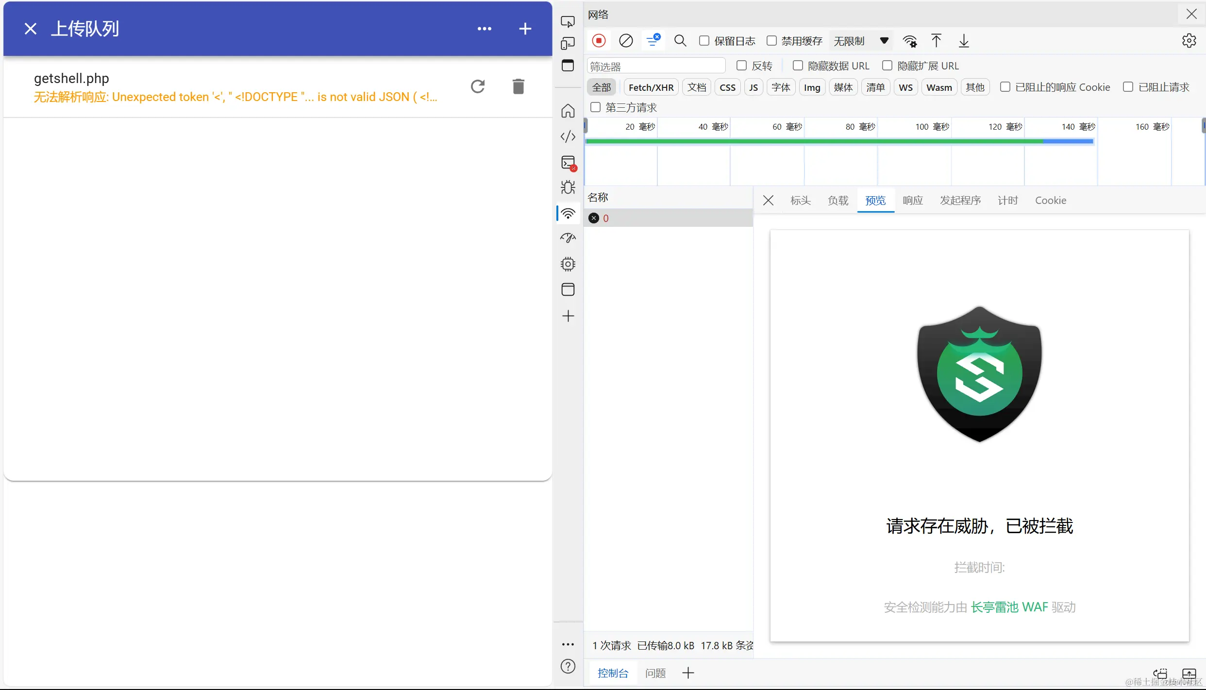 可以很明显看到,我们的上传文件操作出错了,打开请求一看,哦,是雷池。
