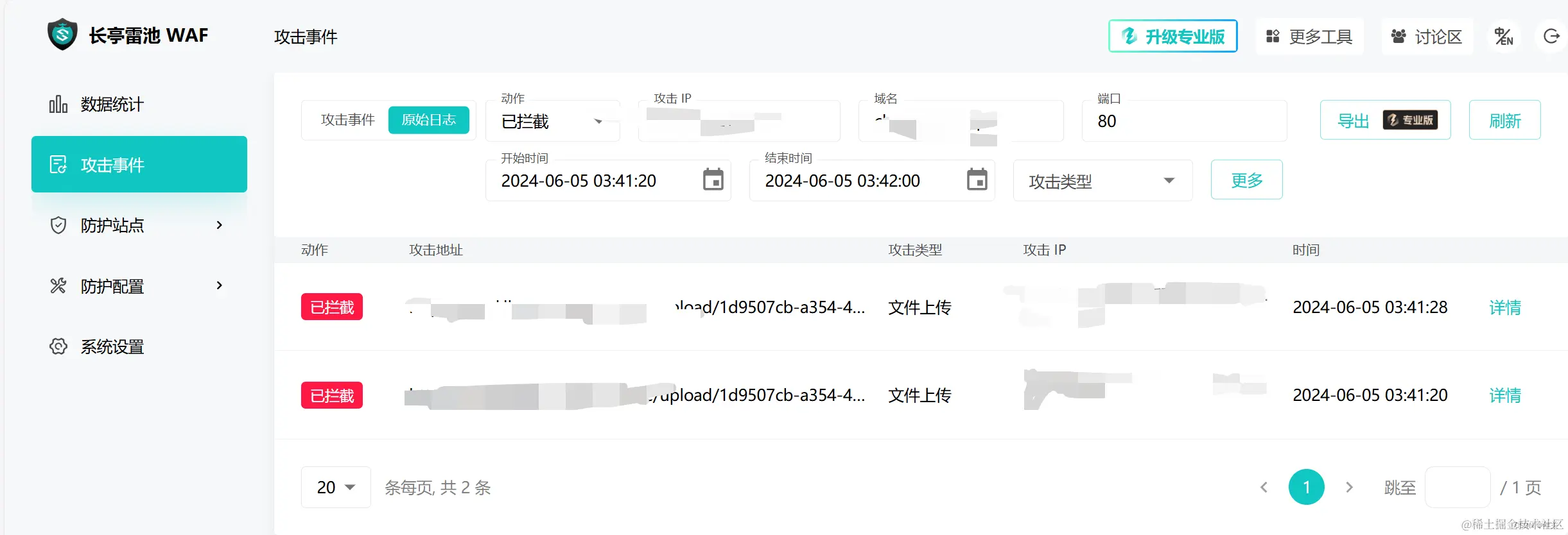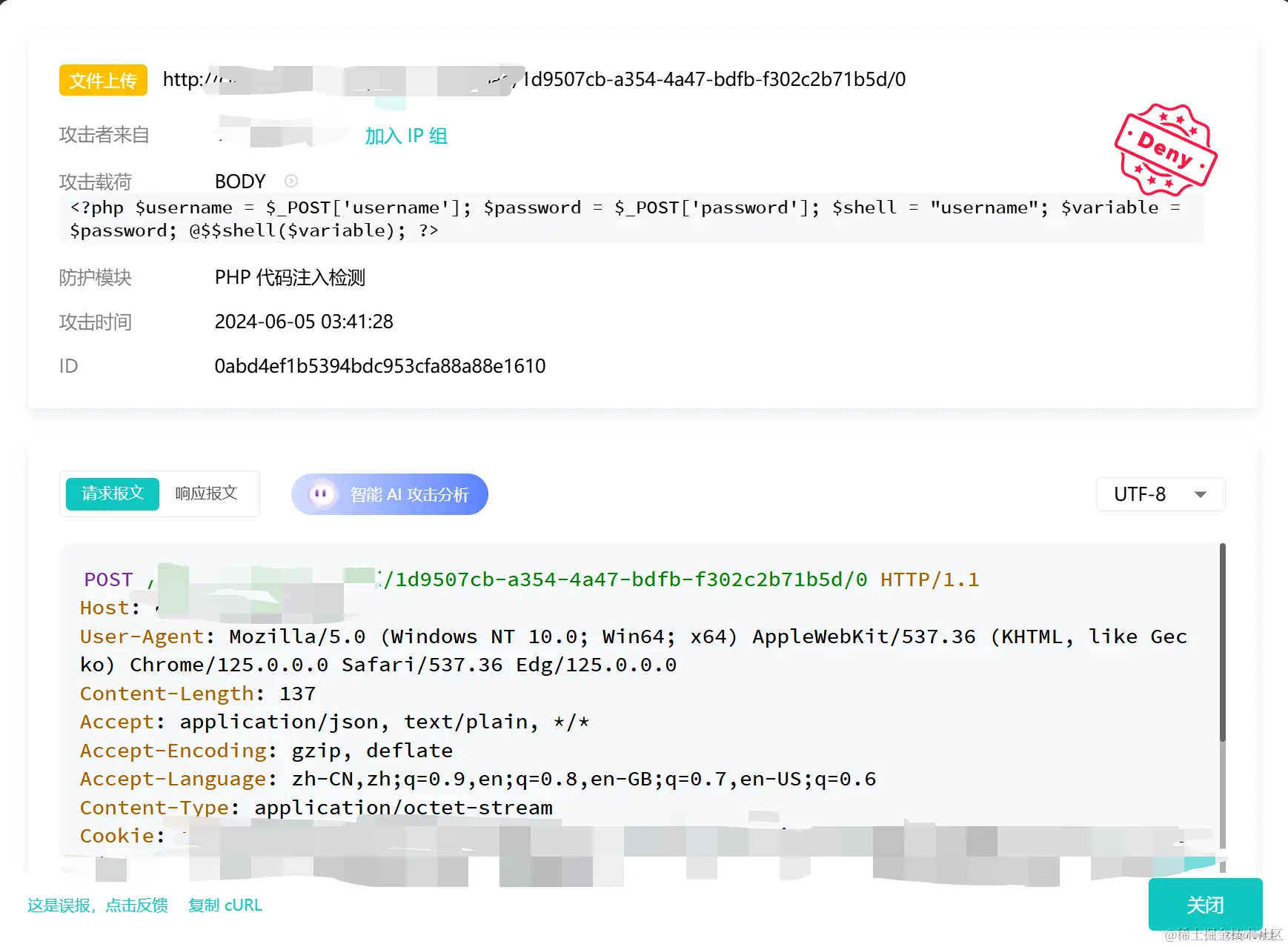 这里可以看到,系统提示我的网站正在遭受攻击,防护效果还是不错的。清楚的标明了攻击者的ip,被攻击的日志记录,还可以进行ai分析。