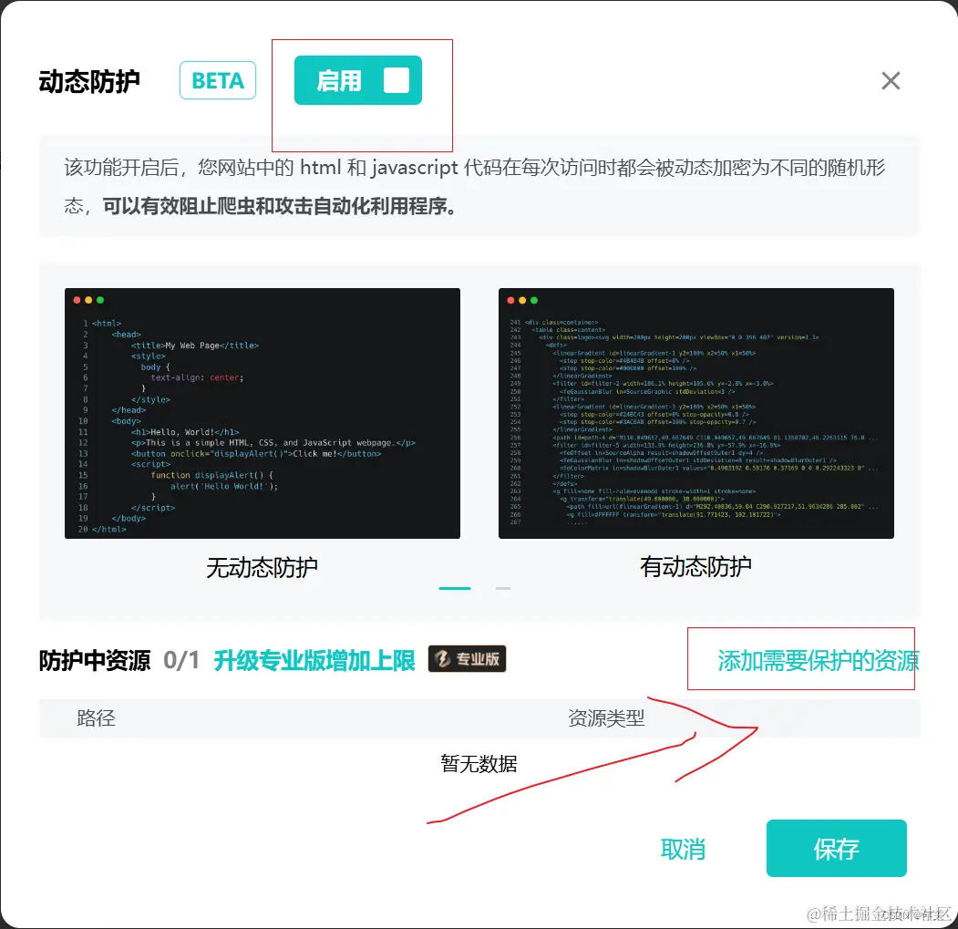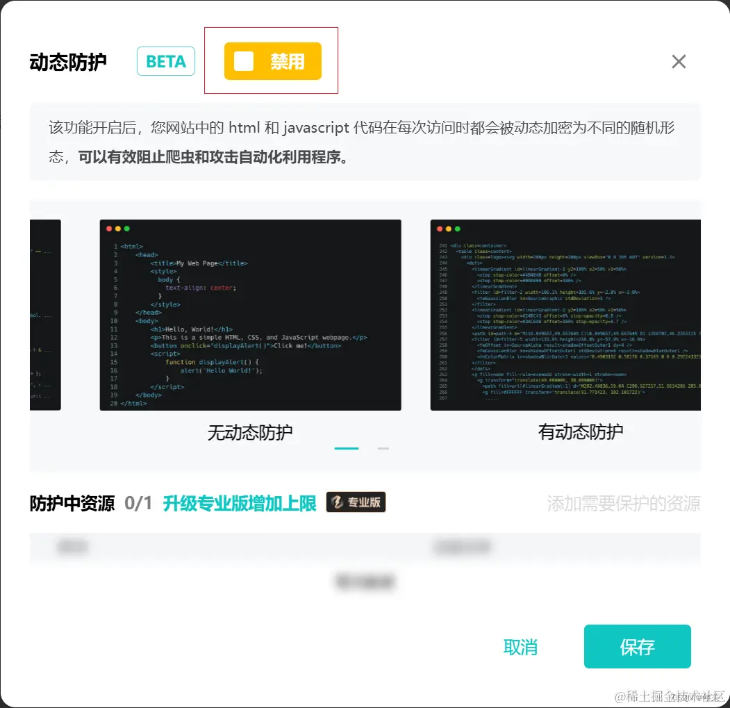 从上面的对比中我们可以看到,在选中需要防护的资源后,页面会提示已经被waf保护了,这个时候我们可以看到,原来页面上的原始代码,已经变成了被混淆后的代码,安全性大大提高了。