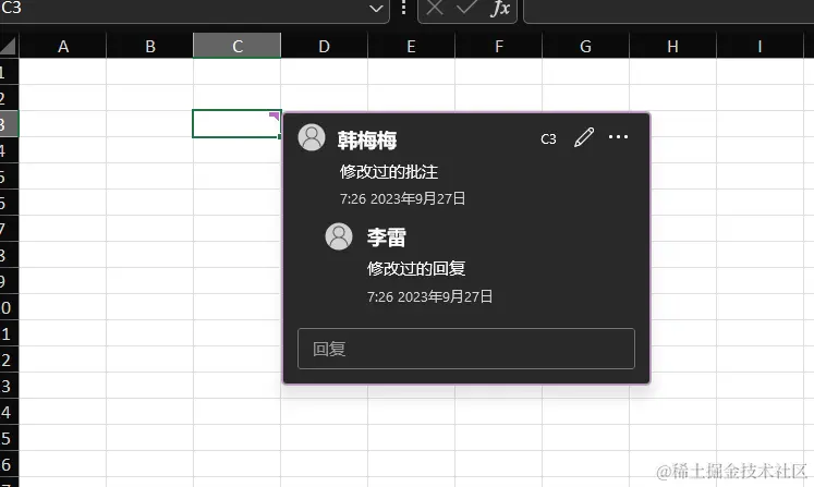 worksheet.getRange("C3").getComment().setText("修改过的C3注释");