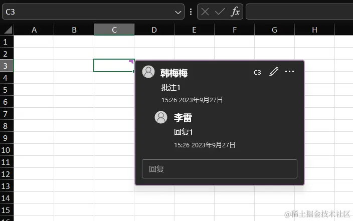 ICommentThreaded ct = sheet.getRange("C3").addCommentThreaded("批注1","韩梅梅");