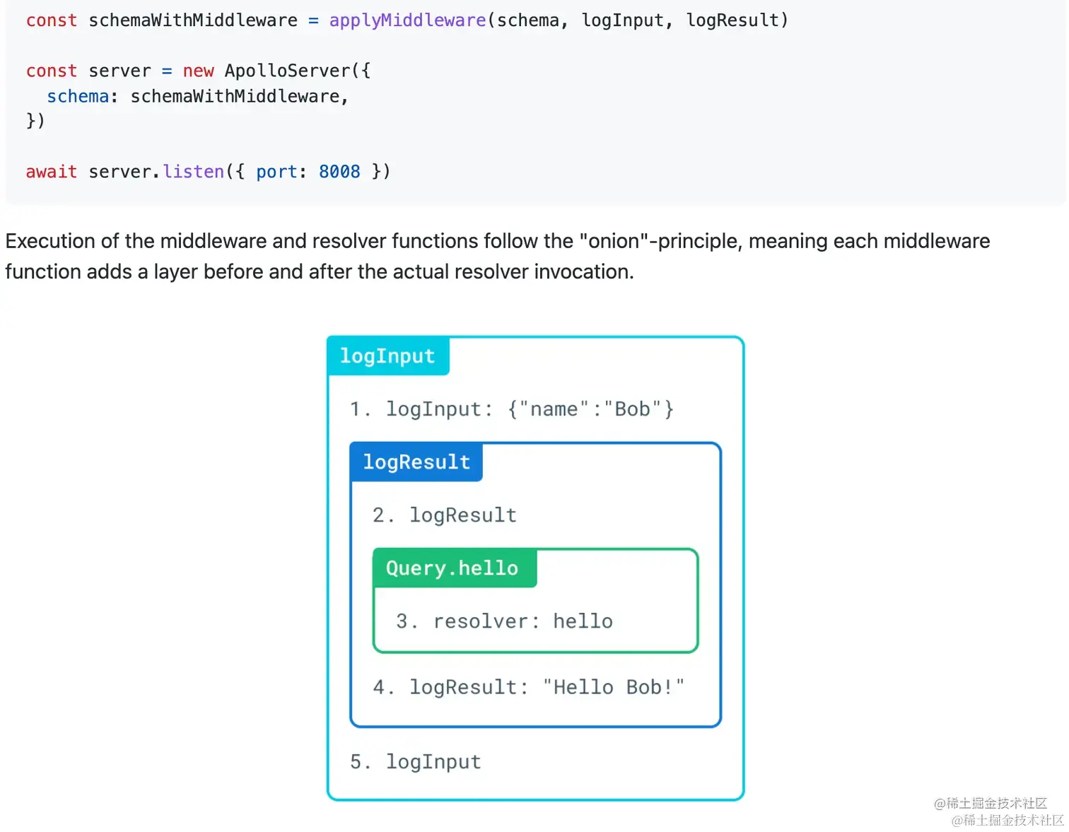 大白话讲,graphql-middleware 就是给 resolver 打辅助的预处理/后处理逻辑,是围绕着 resolver 的洋葱模型(下图)。适用于通用的 resolver 辅助逻辑,如: