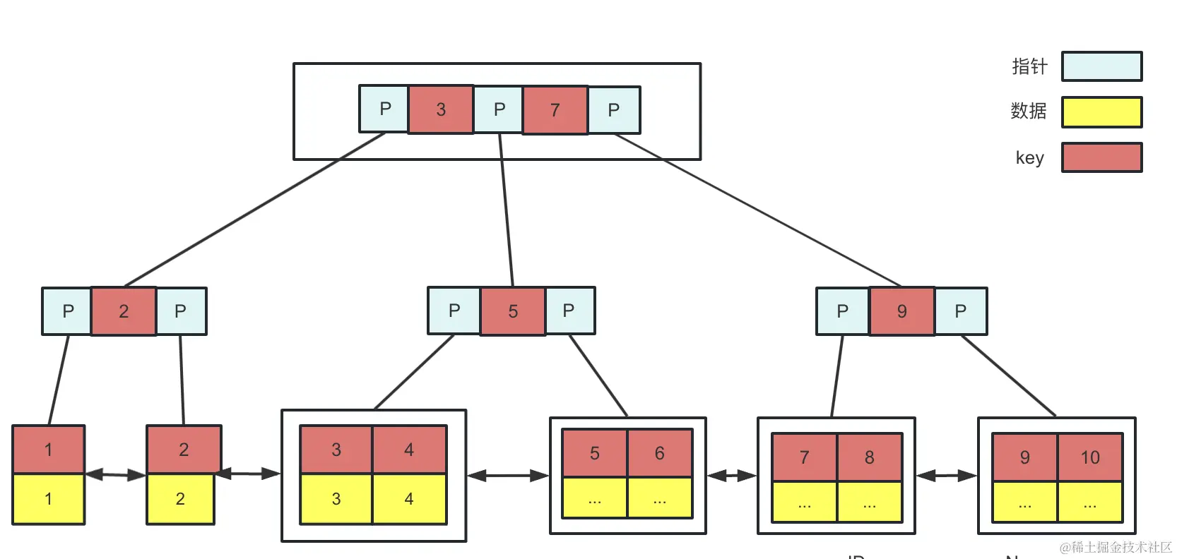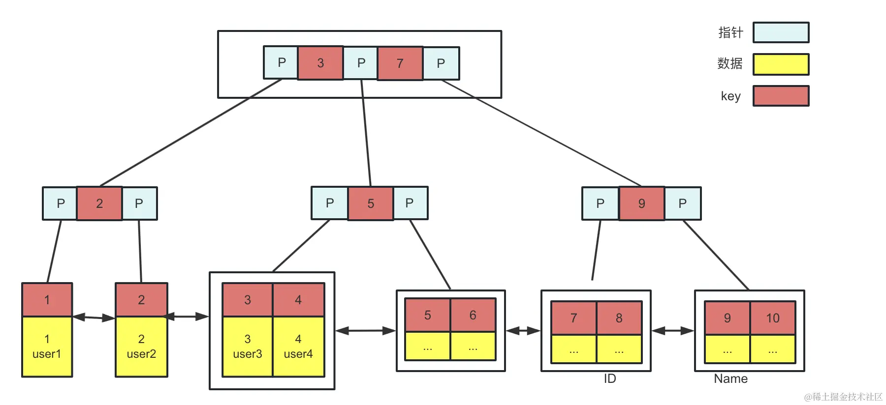 - B+树的节点中存储着多个元素,每个节点内有多个分叉