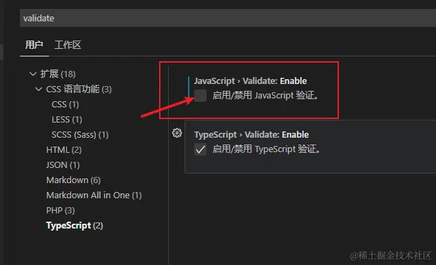 解决vscode中在js文件中报ts检测提示 北极光72 2024-06-04 636 阅读1分钟 解决vscode中在js文件中报ts检测提示 1. 遇到的问题 vscode中在js文件中报ts检测语法提示 2. 解决方法 在设置中查找validate 找到 Typescript 设置,将 JavaScript>Validate:enable 设置为禁用, 或者在settings.json中添加 "javascript.validate.enable": false