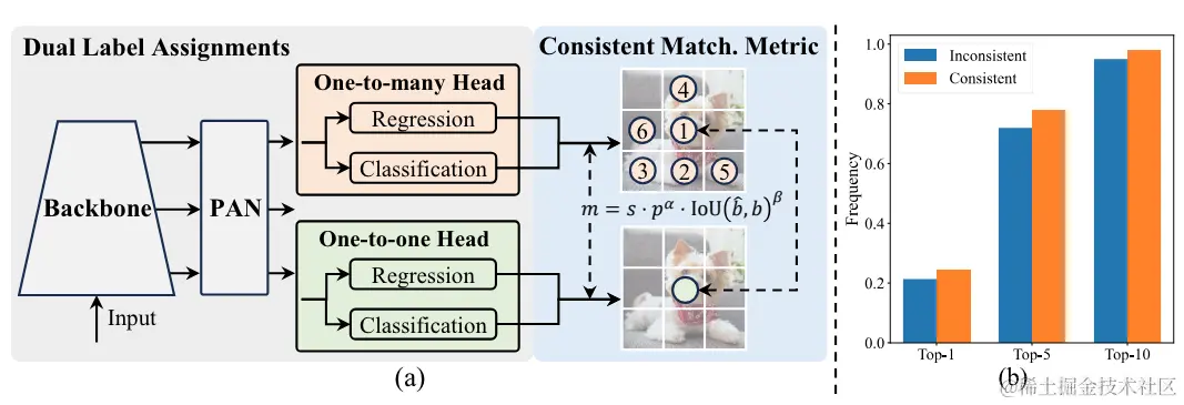传统 YOLO 模型在训练过程中使用一对多标签分配策略,这会导致推理阶段需要 NMS 进行后处理,降低了效率。为了解决这个问题,YOLOv10 采用了一致性双重标签分配策略 (Consistent Dual Assignments) 。该策略将一对多标签分配与一对一标签分配结合在一起,既保留了前者的丰富监督信息,又避免了 NMS 的需要。在训练阶段,模型同时优化两个分支,而在推理阶段,则直接使用一对一分支进行预测,从而实现了端到端部署。