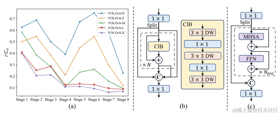 - 秩引导模块设计 (Rank-Guided Block Design): YOLOv10 通过分析不同模块的秩 (Rank),根据模块的冗余程度采用不同的模块设计,例如,在冗余度较高的模块中采用更紧凑的结构,从而提高了模型效率。