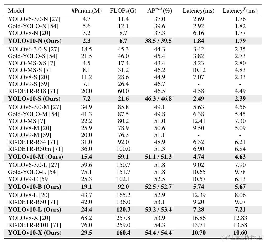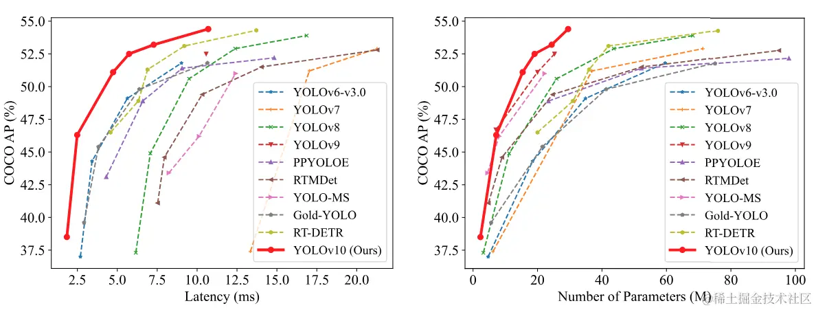 - 参数量和计算量减少: 与 YOLOv9-C 相比,YOLOv10-B 速度提升 46%,参数量减少 25%,精度保持一致。